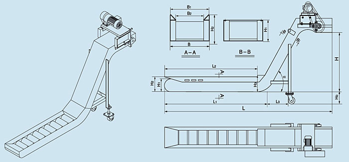 | 名稱 | 水平長度 | 外殼寬度 | 接屑寬度 | 有效排屑寬度 | 提升高度 | 提升角度 | 支腿高度 | 外殼高度 | 水平高度 | 入屑口高度 | 總長度 | 接屑長度 | 支腿距離 | ||||